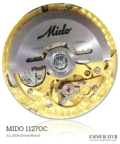 The Mido 1127OC watch movement, used from 1966 to 1970, features an indirectly driven minute and automatic gear integrated into the movement, allowing for a low-profile design. It includes a ratchet on the dial side and a crown mechanism with a rocker bar. The smaller rotor employs a ball bearing. Detailed differences between the Movado 387 and 389 are currently unknown. The movement offers functions such as automatic winding, sweep seconds, and a quickset date function.