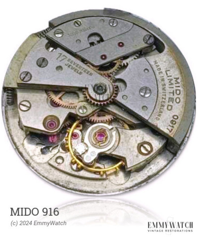 The Mido 916 watch movement incorporates a ball-bearing rotor and an excenter winding mechanism. It offers automatic winding and includes functions such as sweep seconds, adjustable stud holder, and shock protection. This movement was used in watches during approximately the 1970s.