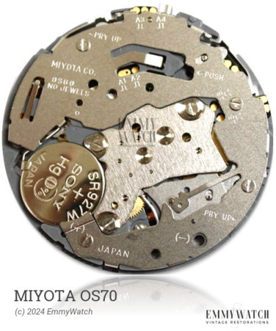 The Miyota OS70 is a quartz watch movement with a long-life version that does not include a second hand. It features an analog display, with timekeeping displayed through hours and minutes, as well as a date function with quickset capability. The movement is controlled by a quartz-controlled stepper motor. This particular movement model was utilized around the period of 1990.