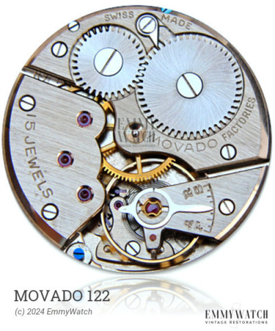 The Movado 122 watch movement is a manual wind movement that features a indirectly driven minute hand, allowing for a large balance and a low profile design. It also includes a sweep seconds function. This movement was commonly used around the year 1975.
