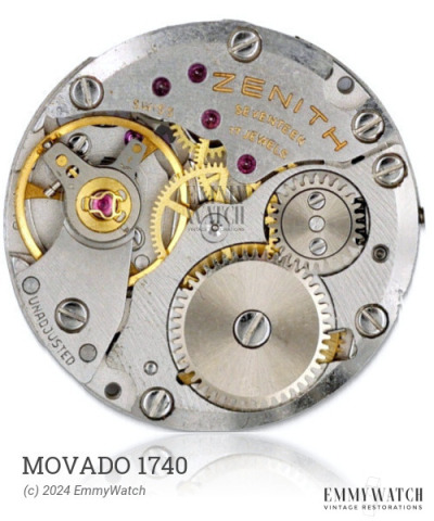 The Movado 1740 watch movement features a Girocap combined setting for the escapement wheel. It is a manual wind movement that was commonly used around 1960.