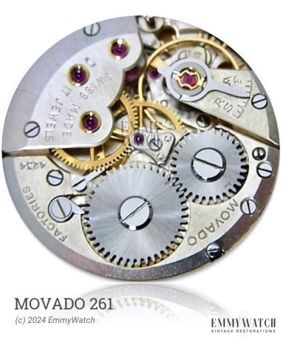 The Movado 261 watch movement is an open face calibre with stem wind and set functionality, featuring a sub second hand. The specific differences between the 488, 490, 492, and 514 variations are not known. This movement was commonly used around the period of 1935.