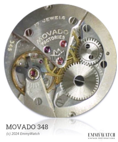 The Movado 348 is a manual wind mechanical watch movement with a sub second and date function. It was commonly used around 1965.
