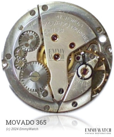 The Movado 365 watch movement features an early fixed or later mobile stud carrier, which enables it to have an indirectly driven minute and a very large balance. The specific differences between the Movado 365 and Hamilton 211 movements are currently unknown. This movement includes functions such as manual winding, an adjustable stud holder, and shock protection.