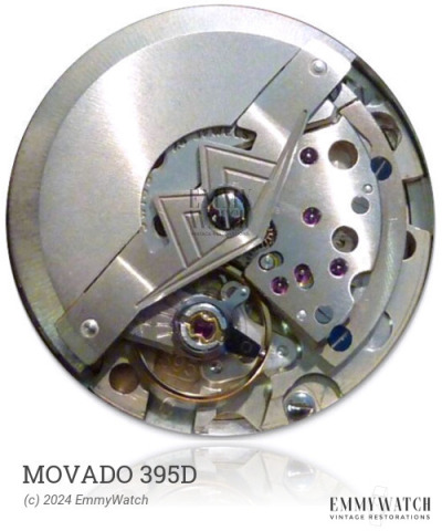 The Movado 395D watch movement, which was utilized around 1965, features a rotor positioned out of center and integrated winding gear. This design resulted in an exceptionally slim movement for its time. The movement incorporates a detached manual wind and Helvetia escapement. Additionally, it is equipped with Kif-Duofix combined settings for the escape wheel. Noteworthy functions of this movement include automatic winding, sweep seconds hand, adjustable stud holder, and shock protection. Its notable feature is the implementation of a ball-bearing rotor.