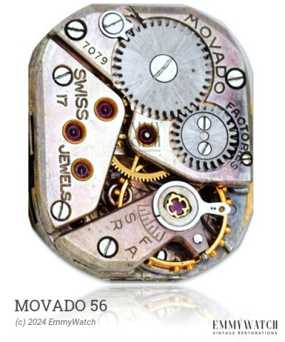 The Movado 56 watch movement is a modified version of the Peseux 336 movement. It is a manual wind movement featuring a sweep second hand and a date function that can be set by +/-24 hours.