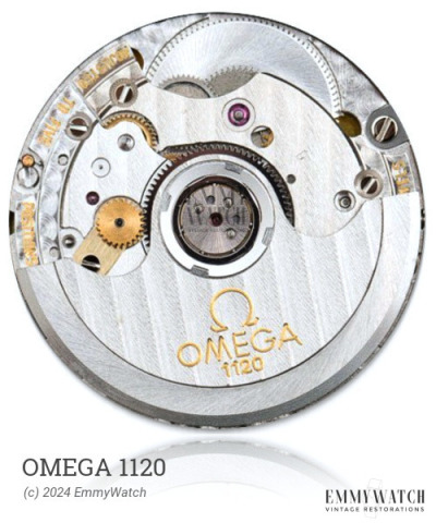 The Omega 1120 is a detached manual wind watch movement with jewel bearings for the barrel. It features automatic winding, sweep seconds, quickset date function, shock protection, and a calendar. This movement was used during the period of 1977-1979.