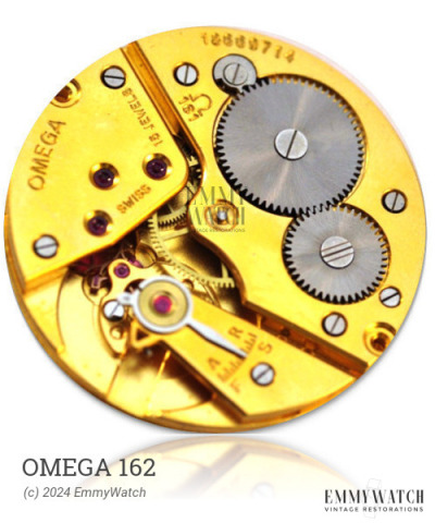 The Omega 162 is a manual wind watch movement that features sub seconds and a date function which can be set by changing the time to 19:15-24h. It also includes a sub seconds display and a calendar. The movement was introduced in 1968 and has been in use since then.