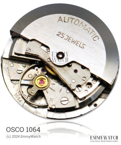 The Osco 1064 watch movement, produced from 1977 onwards, features a micrometer regulator and is equipped with two serially coupled barrels. One barrel contains a fixed spring while the other utilizes a slip spring mechanism. The movement is considered equivalent to the Longines 990. It includes functions such as automatic winding, quickset date, and has been in use since 1977.