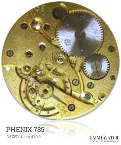 The Phenix 785 watch movement is a manual-wind chronograph movement with various functions. It includes a sub second hand and features a pillar wheel mechanism for precise timing. The movement also includes a calendar function, with the day displayed at 10:30h, date hand at 12h (adjustable using a pusher at 8h), month at 1:30h (adjustable using a pusher at 10:15h), and a moon phase at 12h (adjustable using a pusher at 9:45h). The movement is part of a series (281-284) with different pillar plate sizes. The Phenix 785 movement was used approximately in 1954. The existence of a common pusher for the month and moon phase function is uncertain.