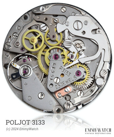 The Poljot 3133 is a manual wind mechanical watch movement that was commonly used around 1945. It belongs to a group of movements, including the 1051, 1085, 1102, 1108, 1137, 1258, 1262, 1271, 1275, 1292, 1296, 1301, 1374, 1385, and 1452, with slight differences that are not well documented. The 1324 movement features a sweep second function.