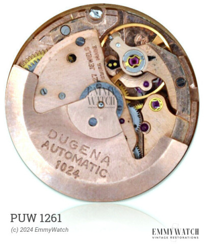 The Puw 1261 watch movement, produced between 1955-1960 as part of the 470, 490, and 500 families, had a total production count of 1,075,000 units. It featured a detached manual wind mechanism and was partially used as chronometers. The movement included functions such as automatic winding, sweep seconds, and a calendar with date adjustment done by changing the 23-24 hour setting.