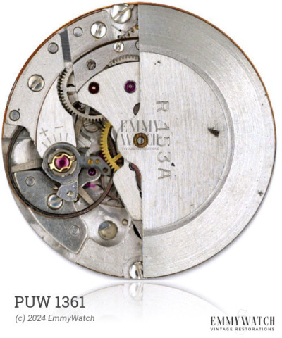 The Puw 1361 watch movement, introduced around 1958, is an automatic movement with a unique feature. Unlike traditional manual-wind calibers, the winding gear is integrated within the movement itself. This design choice allowed for an acceptable height, despite the relatively high base movement. Additionally, the sweep seconds hand is driven by a magnet in a bushing, ensuring a smooth and precise motion. The end of the sweep-second arbor interfaces with a polished surface on the magnet, eliminating the need for a friction spring. Although these are some notable features of the Puw 1361 movement, further information about its specific functionality is not provided.