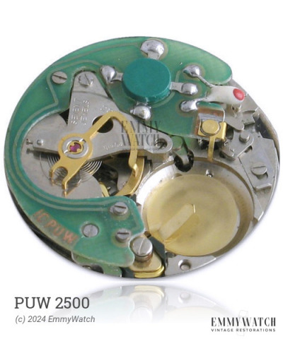 The Puw 2500 watch movement, utilized between 1965 and present, incorporates various features including an electromechanically controlled balance motor, a back crown, a jumping sweep second, and an am/pm display by a dot below/above the date numeral. Moreover, the date can be adjusted by setting the hands back and forth, with each adjustment advancing the date by half a day. Care must be taken to ensure that the dot indicating day or night is aligned correctly. Furthermore, this movement includes an electrical and mechanical hack feature.