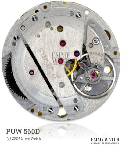 The Puw 560D watch movement, which was patented with a space-saving train design in two layers, offers an optional bimetallic screw balance. Although the specific differences between the 80, 86, 93, 113, 114, 116, 117, 128, 133, 134, 144, 146, 148, 153, 157, 167, and 177 variants are not known, the Puw 560D movement functions as a manual wind movement. It was commonly utilized in watches during the approximate period around 1930.