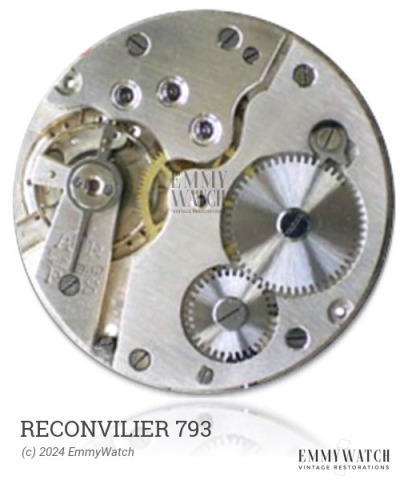 The Reconvilier 793 is a manual wind, back-winder watch movement that was used from 1963 onwards. It features a straight lever escapement and is equipped with Incabloc Shock Protection. The movement also includes the function of backwinding.