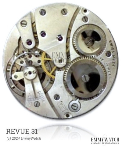 The Revue 31 is a manual wind watch movement with a sub-second function. It features a bridge layout that differs from the common AS 1525. The specific differences between the 25.09, 25.19, and 25.29 variants are not known. This movement was used during the period around 1960.
