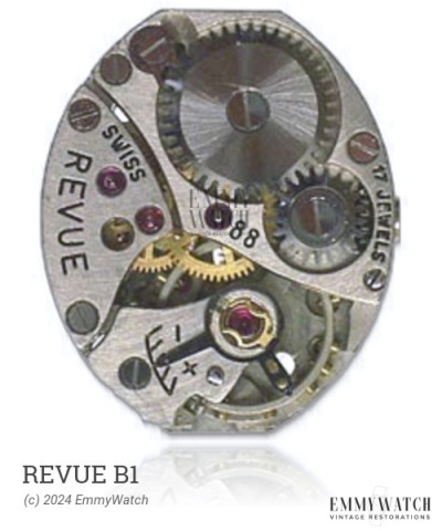 The Revue B1 is a mechanical watch movement that shares similarities with the Zenith 1520, excluding the excenter regulator and the Kif Duofix. It features a combined setting for the escapement wheel known as Kif-Duofix. The movement is manually wound and was commonly used around 1964.