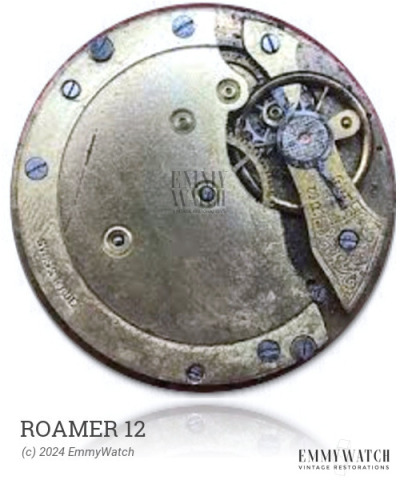 The Roamer 12 watch movement, produced from 1954 to 1954, had a production quantity of 1000 units. This model, known as model 4, features a Breguet hairspring and a lever with cap jewels. The movement is a manual wind with a sub second function.