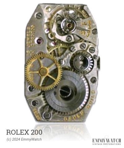 The Rolex 200 watch movement, produced from 1954 to 1966, is a budget version of the Junghans-693 family specifically adapted for Diehl watches. It features a pin-lever escapement, a ratchet on the dial side, and a crown mechanism with a rocker bar. This movement includes manual winding, a sweep second hand, and a date function that can be set by changing the time from 22:50 to 24h.