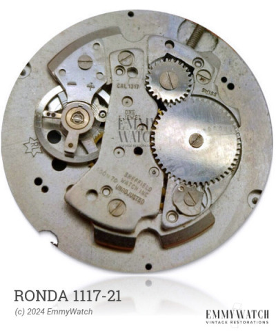 The Ronda 1117-21 watch movement is a manual wind movement, with a sweep second that advances in second steps. It also features a hack mechanism, allowing precise time-setting. This movement was produced around the year 1955.