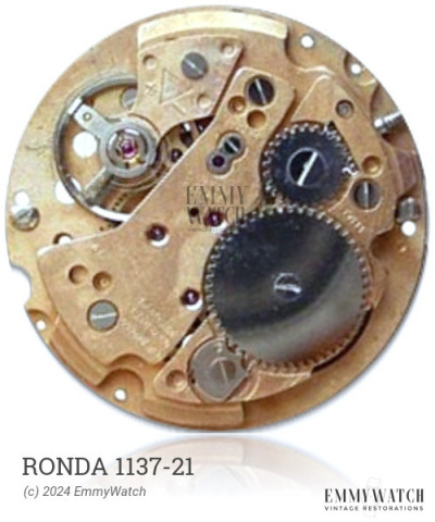 The Ronda 1137-21 watch movement is part of a series of movements, including the 984, 1009, 1010, 1013, 1028, 1033, 1035, 1038, 1048, 1050, 1055, 1077, 1084, 1089, 1091, 1211, 1218, 1231, 1259, 1277, 1285, 1313, 1377, 1440, and 1614, with no known differences except for bridge shapes. Its notable features include manual winding, sub-second and sweep-second functions, and automatic winding capability. It also incorporates KIF Shock Protection. The Ronda 1137-21 movement was utilized approximately in the 1940s.