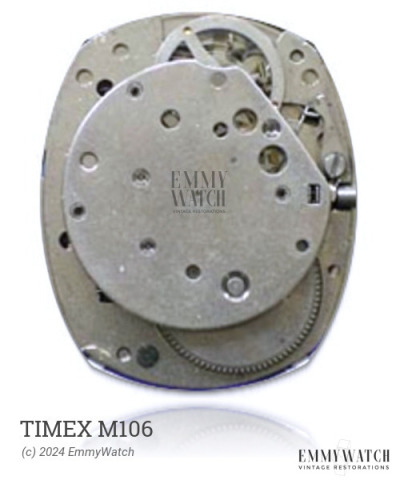 The Timex M106 is a manual wind mechanical watch movement featuring a sweep second hand. Its indirect minute drive enables a large balance and a low profile. The movement also includes various functions such as a quickset date feature, a hack mechanism, stop seconds function, and a sweep seconds hand. It was commonly used around the period of approximately 1975.
