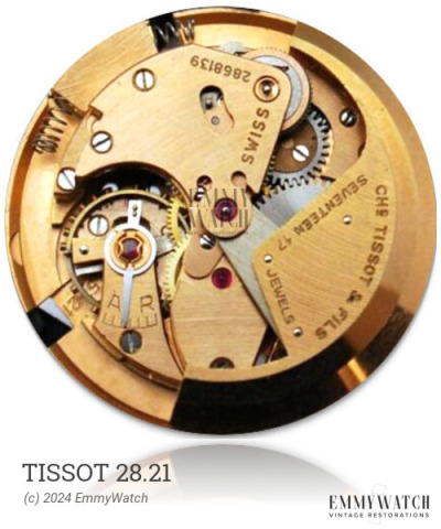 The Tissot 28.21 is an automatic mechanical movement with a sweep second hand. Its design allows for a relatively large balance wheel and low profile due to the indirect driving of the minute hand. During its production period from 1969 to 1976, the rotor of this movement was modified. Additionally, it features functions such as setting the day by +/-24 hours and setting the date by changing the time to 20:15-24 hours.