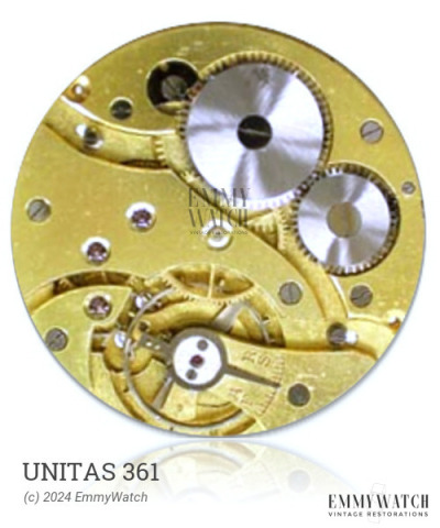 The Unitas 361 is a manual wind watch movement with a sub-second function. It was produced by FHF in their Fontainemelon factory. The movement is part of a series of calibres, including the Gruen 100, 101, 620 through 623, 626, and 627, that are based on the FHF Robert 8.75''' calibre downsized to 8'''. However, specific differences between these calibres are not known. The Unitas 361 movement was used from 1918 onwards.
