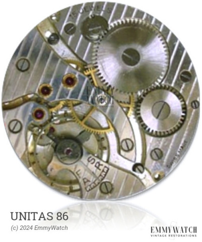 The Unitas 86 watch movement, utilized in various models including the 71, 73, 75-80, 144, 166, 167, 203, 205, 216, 219, 240, 244, 255, 268, 284, 286, 287, and 326, features a bimetallic screw balance. It incorporates manual winding functionality and includes sub-second and sweep second functions. This movement was commonly employed in watches manufactured around the approximate period of 1935.