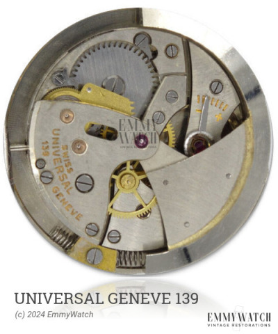 The Universal Geneve 139 watch movement is an automatic (bumper) movement that features sweep seconds. It was primarily used in watches produced around 1955.
