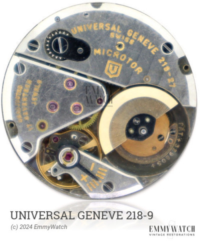 The Universal Geneve 218-9 watch movement, used from 1965 onwards, features a micro rotor and incorporates a double jewel bearing with 30 jewels. It includes a double excenter regulator for curb pins and stud carrier, as well as a selfwinding gear with direction switching facilitated by a pinion positioned between two large jewels. The movement's design allows for a low profile due to its indirectly driven minute and second hands. Minor modifications to the base plate and simplified date driver were implemented around 1966/67. In addition to being an automatic movement, it includes functions such as a sweep second hand and a date feature that can be set by changing between the 23rd and 24th hour, with a later modification changing the range to the 22nd and 24th hour.