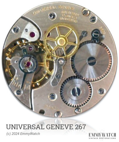 The Universal Geneve 267 watch movement is a manual wind mechanism that was used during the period of 1935-1957. It features a bimetallic screw balance and utilizes a Breguet hairspring.