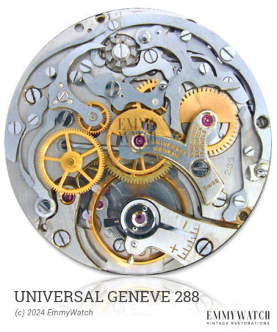 The Universal Geneve 288 is an open face calibre watch movement that offers both pin or pallet lever options. It features a stop- and split-second function with pillar wheels. In the case of the pallet lever option, it incorporates a barrel with Geneva stopwork. The movement includes various functions such as a timer rattrapante with 60-second (0.2s) and 30-minute capabilities, operated by a pillar wheel. Additionally, it has the possibility of a 30-second (0.1s) and 15-minute option, an addition timer, stem winding, and a sweep second hand. The Universal Geneve 288 movement was widely used around 1980.