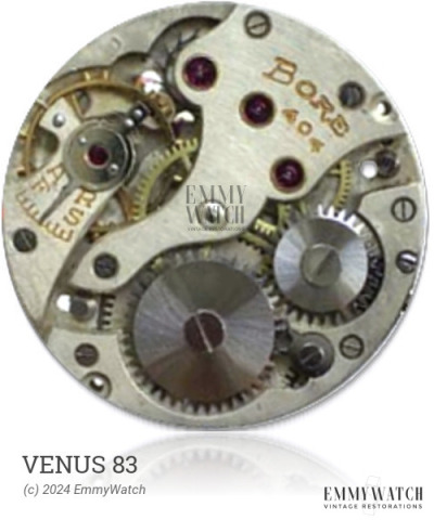 The Venus 83 watch movement, which was produced from 1935 to 1967, encompassed a production of less than 16,000,000 units. It did not include a separate escape-wheel cock, and its movements featured various balances with both similar and distinct calibre designations. The calibre designations had minor differences, enabling parts interchangeability. The movement functioned as a manual wind, sub seconds, date, and calendar movement.
