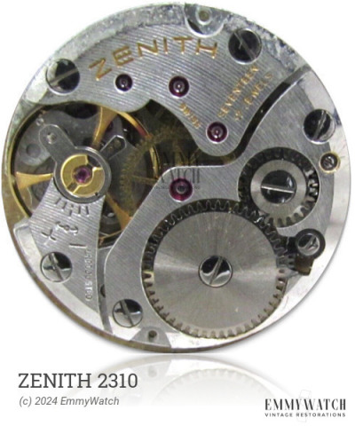 The Zenith 2310 is a manual wind mechanical watch movement introduced around 1970. It features a sweep second hand, a date function with quickset capability, and an optional hack feature. The movement also includes a stop seconds function, allowing for precise time setting, and a sweep seconds hand for continuous timekeeping. The Zenith 2310 is commonly found in vintage watches from the stated period.