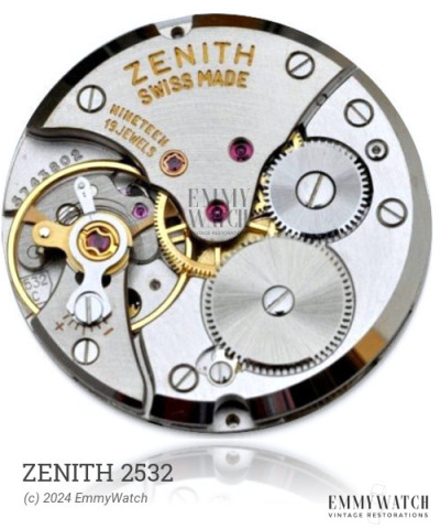 The Zenith 2532 watch movement is a manual wind movement with sub second function. It was initially owned by Election, then transferred to Marvin around 1960, and finally acquired by Longines in the late 60s. The movement's base calibre is shared among these three manufacturers, allowing for interchangeability of many parts. The Zenith 2532 movement was primarily used around the 1950s.