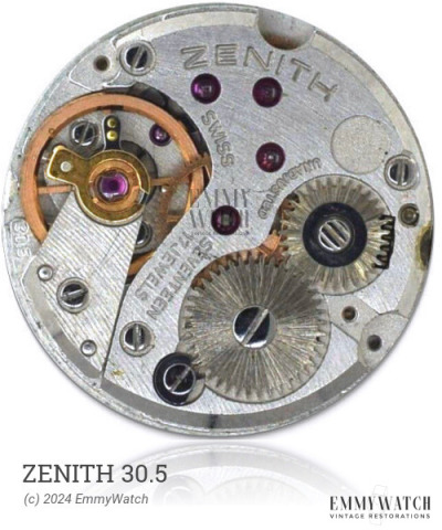 The Zenith 30.5 watch movement is a mechanical movement from the 1960s that is manually wound. It features a sweep second hand and a date function that can be set by changing the time to 21:30-24h. The movement is available in different bridge shapes, but the specific differences between the 74-4N and 745-4N variants are not known.