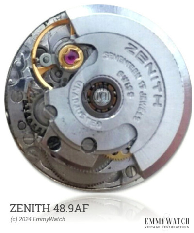 The Zenith 48.9AF watch movement, produced from 1975 to 1978, incorporates an integrated automatic gear within the movement itself, departing from the conventional approach of attaching it to a manual-wind calibre. This innovative design allows for the inclusion of indirectly driven minute and second hands while maintaining a robust rotor bearing in the center space. Notably, this movement offers various functions, including automatic winding, sweep seconds, day and date display, and a stop seconds feature. The day and date can be quickly adjusted, and the movement supports a hack feature.