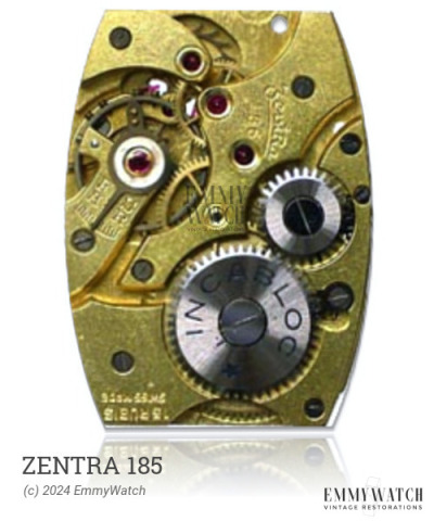The Zentra 185 watch movement, a hunter calibre from the period 1900-1915, features a bimetallic screw balance and a Breguet hairspring. It also incorporates a partially fine regulation gear. The movement is equipped with stem winding and setting mechanism, as well as a sub-second function.