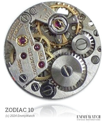 The Zodiac 10 watch movement features a pin-lever escapement and an indirect minute hand friction clutch on the barrel. It employs a flying barrel mechanism and incorporates a single part as a replacement for the setting-lever spring, yoke, and yoke spring. This movement offers manual winding and includes a sweep second function. It was commonly used around the year 1965.