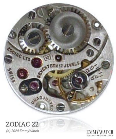 The Zodiac 22 watch movement features a manual wind mechanism and sub-second function. It includes several bridge layouts, although the specific differences between the 717-719, 724, and 726-729 models are not known. These designations are likely catalog code names for the varying bridge layouts. The ETA 725 variation incorporates an indirect sweep second function.
