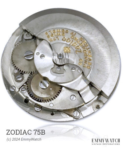 The Zodiac 75B is a mechanical watch movement that was used during the period of 1963-1973. It features a balance staff and stem that differ from those used in ETA movements. The movement is equipped with automatic winding functionality, a sweep second hand, and a date feature that can be set by changing the 21-24 hour range.
