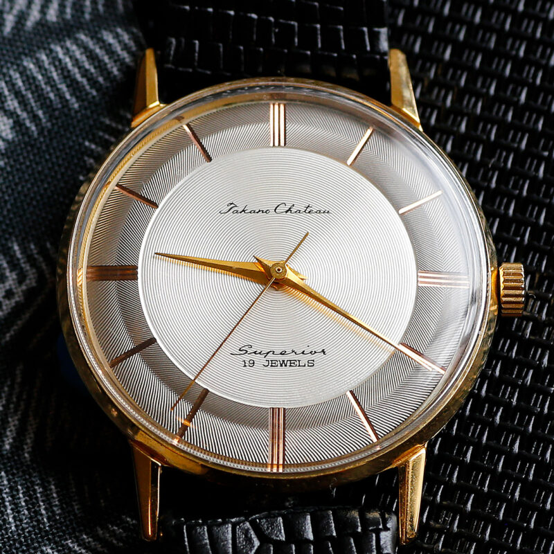 Introducing the stunning 1959 Takano Chateau Superior Guilloché timepiece, a masterpiece of Japanese horology history. Crafted with a 14k gold case and a mesmerizing guilloché di...