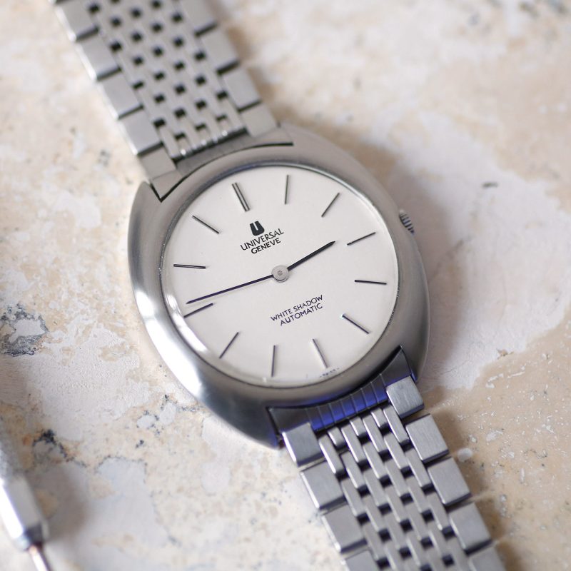 This 1970s Universal Geneve White Shadow is an amazing razor-thin watch designed by Gerald Genta. The watch features the rare deep-blue sunburst dial, beautiful white-stick indicie...