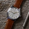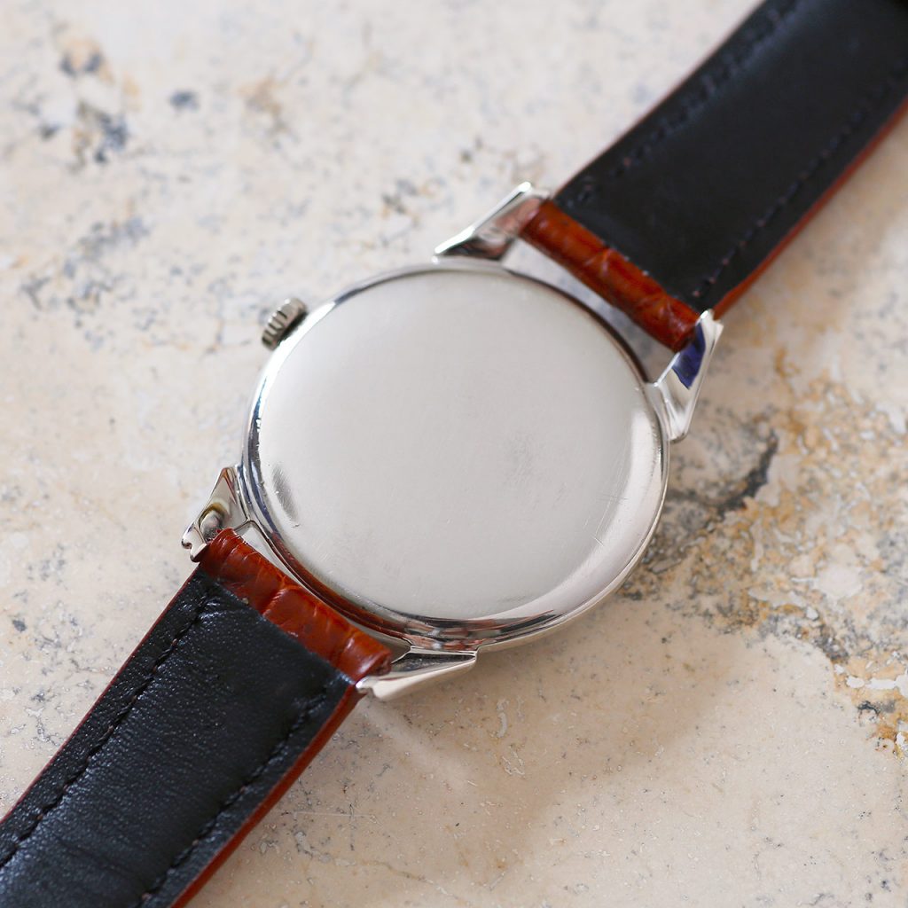 This Cyma features the beautiful hand crafted Cyma 586 hand-wind movement. The beat rate for this watch is 18,000 vph. The movement houses a large mainspring and thus has a good power-reserve. The watch is 38mm in diameter, which was considered an oversized watch at that time. The beautiful stitched strap will fit wrists up to 8″ in diameter making it suitable for any wrist size. The dial, movement, case are all signed Cyma Tavannes.
