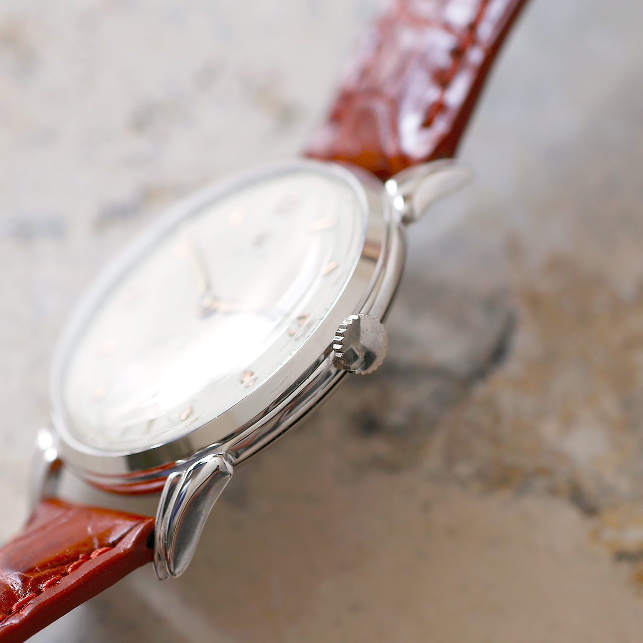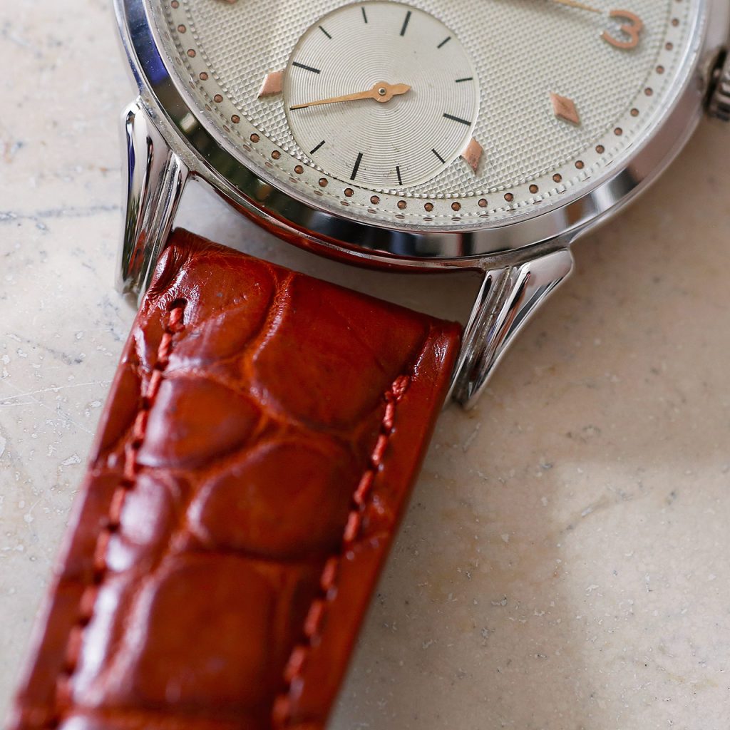 With its thin case design with fancy fluted lugs, its wonderful waffle texture dial with gold applied indicies at hours and minutes, its lovely oversized small-second register, or its impressive Cyma 586 movement finished to a standard you just don’t see often in watchmaking anymore, this watch is sure to impress everyone in a room.