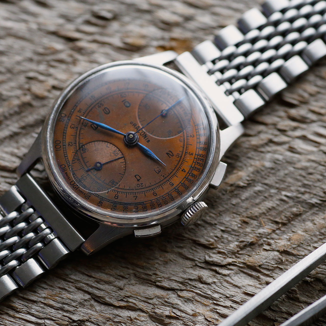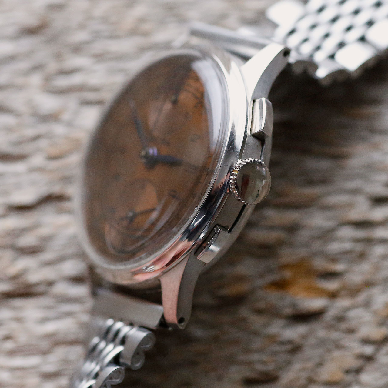An amazing copper dial! This 1940s Draconis Chronograph is a gem. Featuring a stunning copper dial with a perfect warm patina and a unique up-down “big eyes” register design. The watch has beautiful authentic heat blued steel hands all around and comes on a restored vintage beads of rice bracelet. What a unique piece.