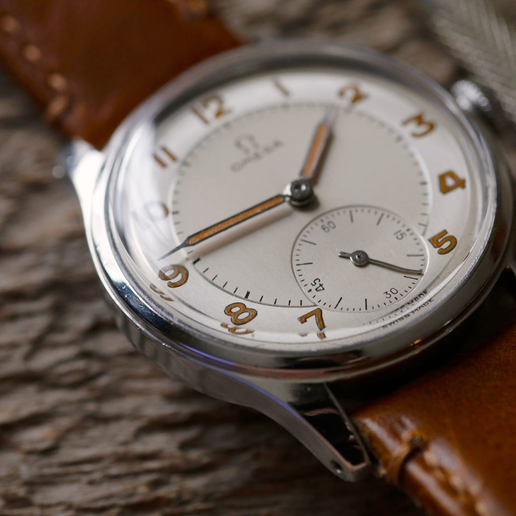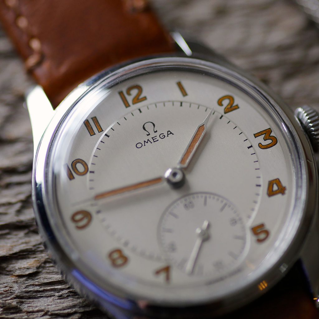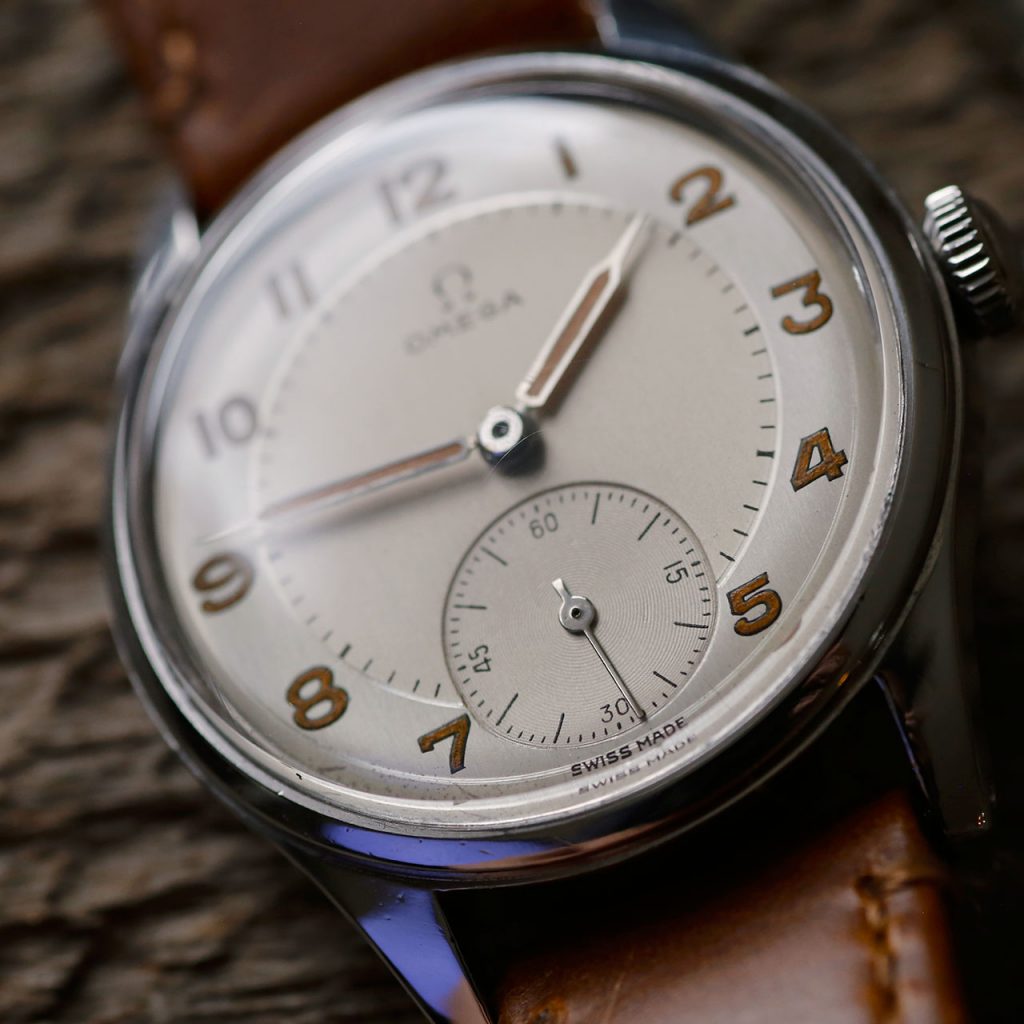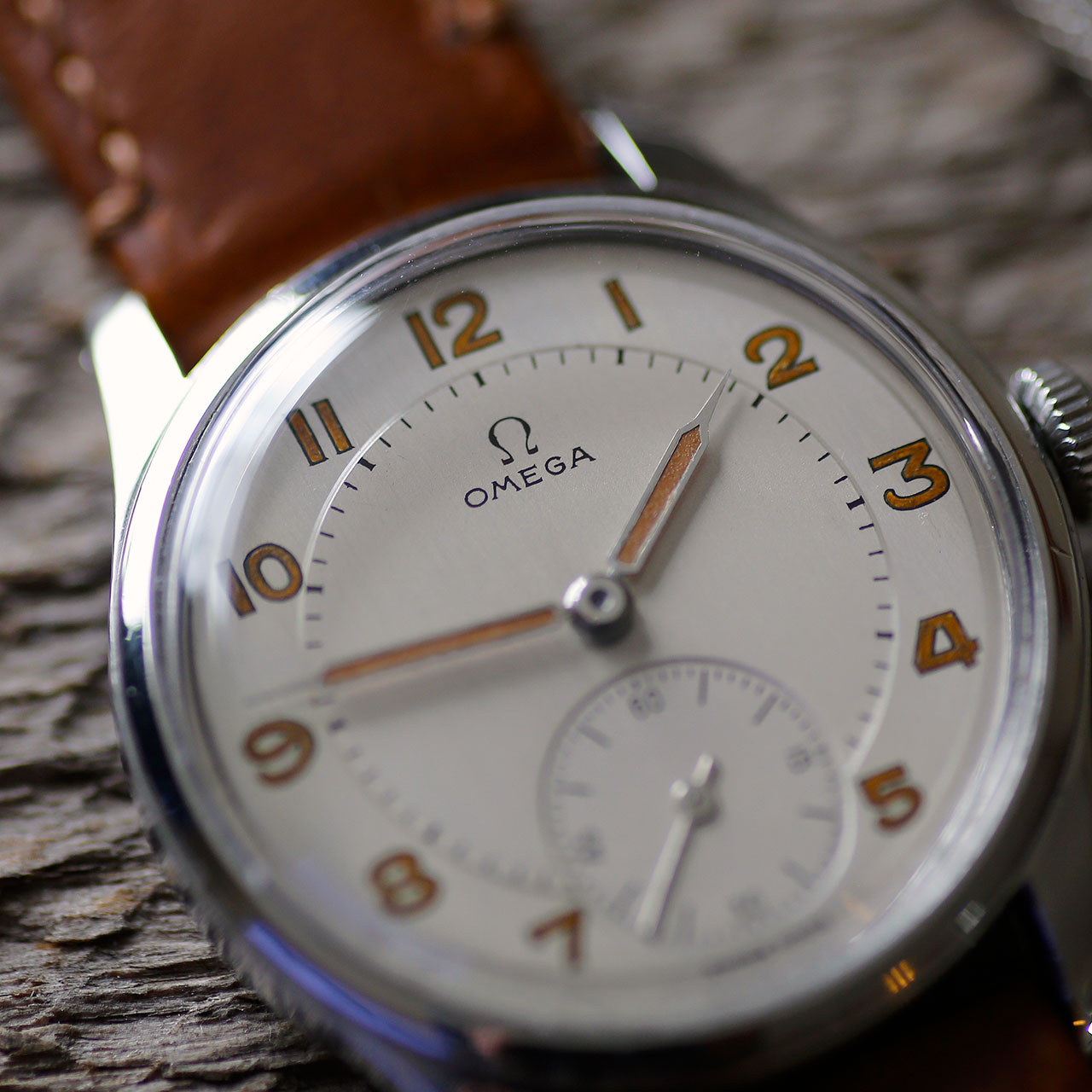This 1947 Omega 30T2PC Military Watch (2383-6) is simply spectacular. Whenever I post pictures of this watch, I always get comments and inquiries as to whether it is for sale, well, now it is! This beautiful watch features a stunning 2 Tone Dial with inlaid metallic strips, an oversized small-second register, and handsome syringe hands. Wow, what a beautiful piece. These 30T2PC watches were some of Omega’s most reliable and best selling watches during the 1940s and were used during WWII.