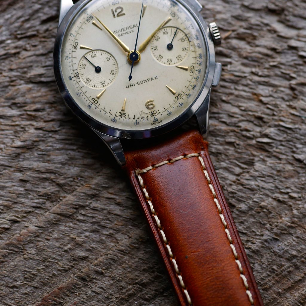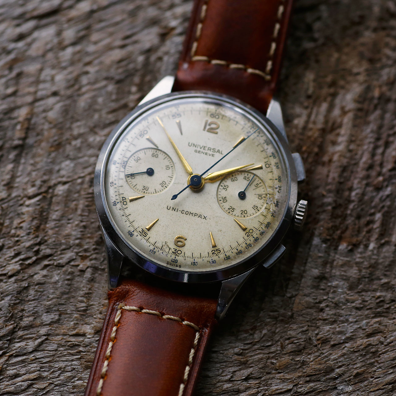 This classic and collectible 1953 Universal Geneve Uni-Compax 22420-1 Dual Register Chronograph is a vintage masterpiece. The watch features a warm beige patina dial with gold markers, gold alpha hour and minute hands, heat-blued sub-dial hands, and a heat-blued center second hand, all of which fit together harmoniously on the new high-end stitched leather strap.